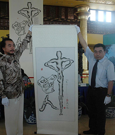 在祖国六十年华诞来临之际,中国艺术研究院一级书画师、北京大学研究员、中国国画家教授、艺坛人称“江北一怪”的当代传奇书画家武微波先生,向海南省保亭黎族苗族自治县捐赠的形体图腾书画作品《中国人》,于3日下午在海南泰达·美丽道画苑成功拍卖,得款560万元。所得款项将全部捐给保亭县作为文化旅游艺术开发基金。